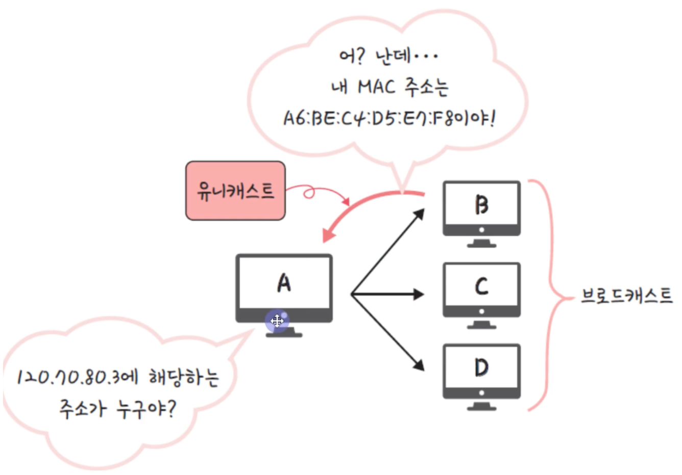 위의 그림처럼 장치 A가 ARP Request 브로드캐스트를 보내서 IP 주소인 120.70.80.3에 해당하는 MAC 주소를 찾습니다. 그러고 나서 해당 주소에 맞는 장치 B가 ARP Reply 유니캐스트를 통해 MAC 주소를 변환하는 과정을 거쳐 IP 주소에 맞는 MAC 주소를 찾게 됩니다.