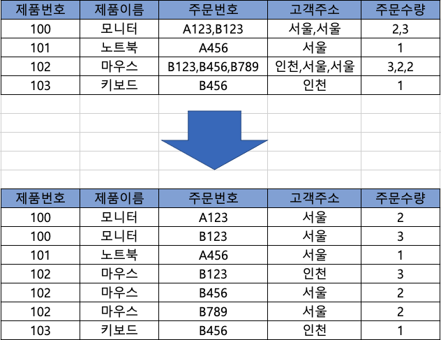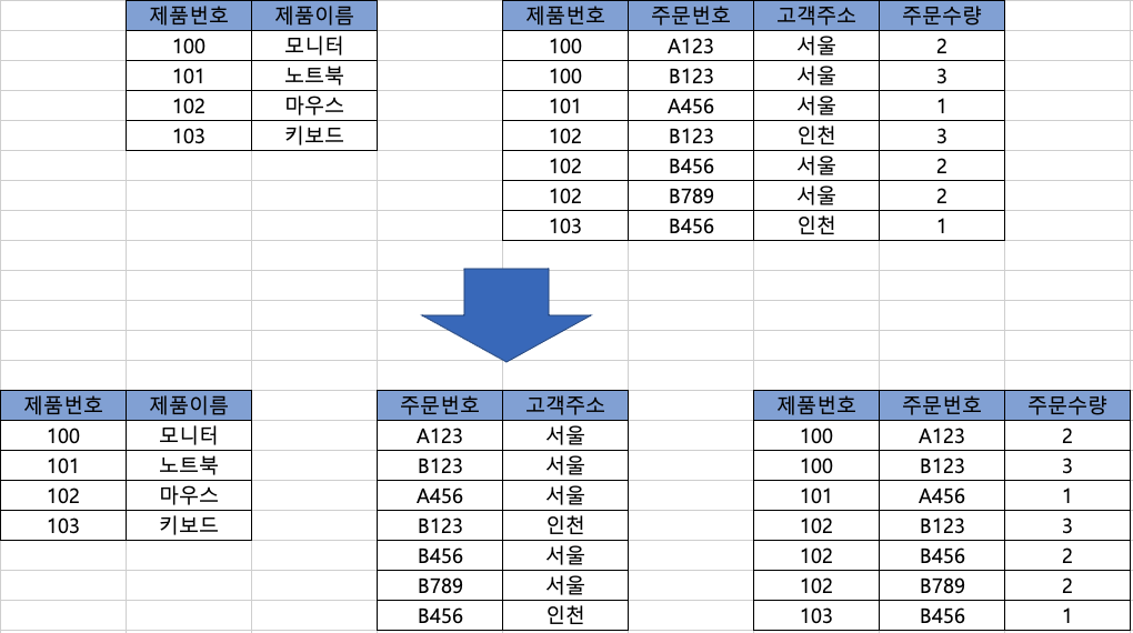 기존 제품 주문 릴레이션은 주문번호와 고객주소가 제품번호에 대해 두 개 이상의 값을 가지고 있습니다. 이를 아래와 같이 반복 집합을 제거하여 제1 정규형을 만족하게 됩니다.