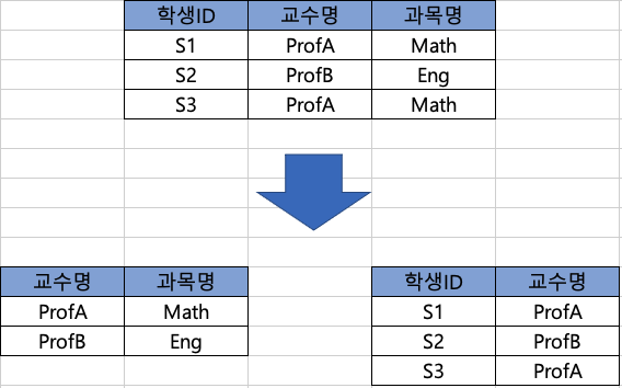 기존 릴레이션에서, 교수는 특정 과목만 가르칩니다. 따라서 교수명 → 과목명이라는 함수 종속이 존재합니다. 하지만 교수명은 이 릴레이션의 슈퍼키가 아닙니다. 따라서 이 릴레이션은 BCNF를 만족하지 않습니다.