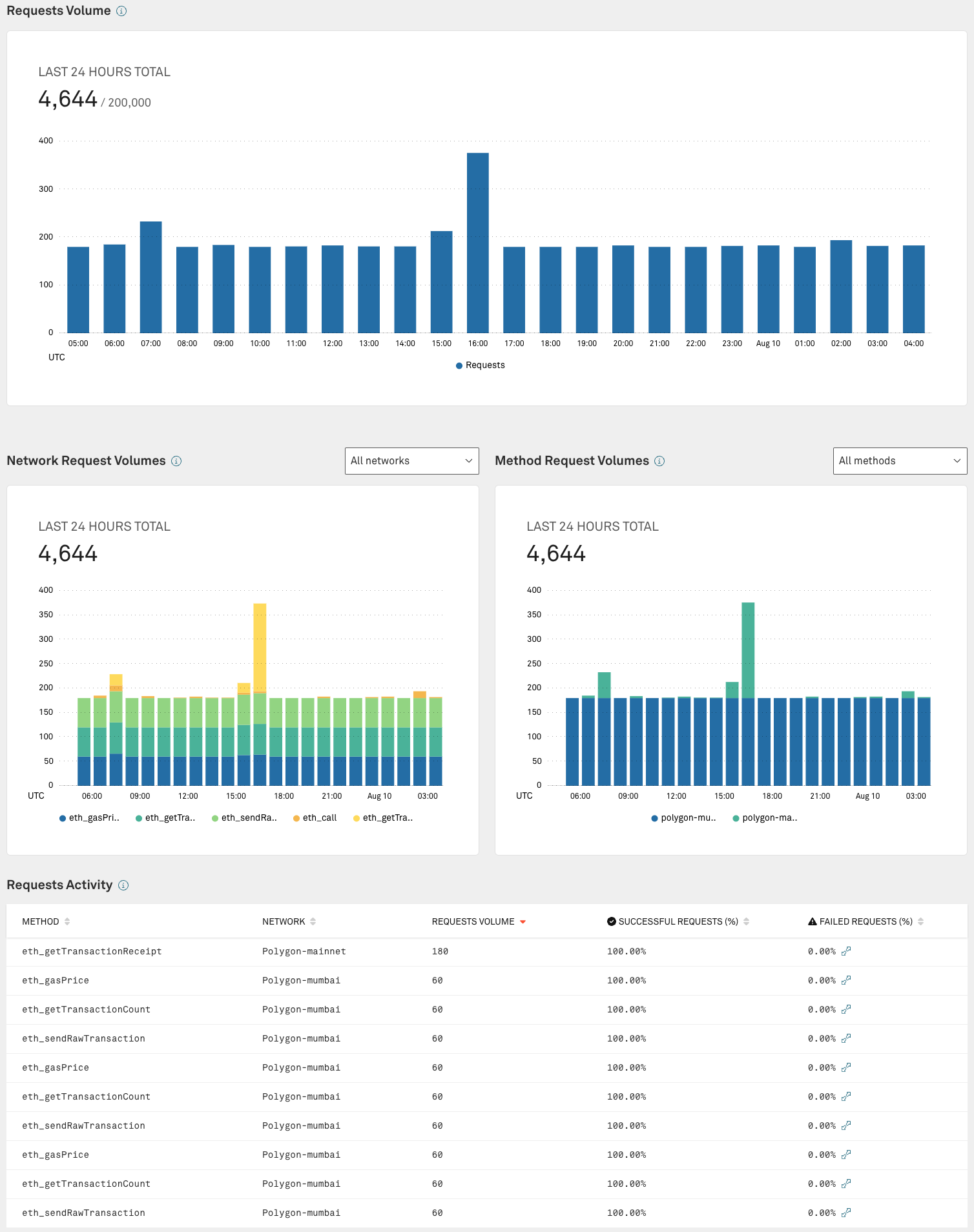 개발자는 Infura Dashboard를 통해 특정 기간 동안 Infura에 전송된 요청량을 확인할 수 있습니다.