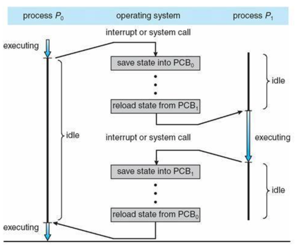 위의 그림처럼 프로세스 P0이 실행하다 멈추고, P0의 PCB를 저장하고 다시 프로세스 P1을 로드하여 실행합니다. 그리고 다시 프로세스 P1의 PCB를 저장하고, 프로세스 P0의 PCB를 로드합니다. 컨텍스트 스위칭이 일어날 때 위의 그림처럼 유휴 시간(idle time)이 발생하는 것을 확인할 수 있습니다.